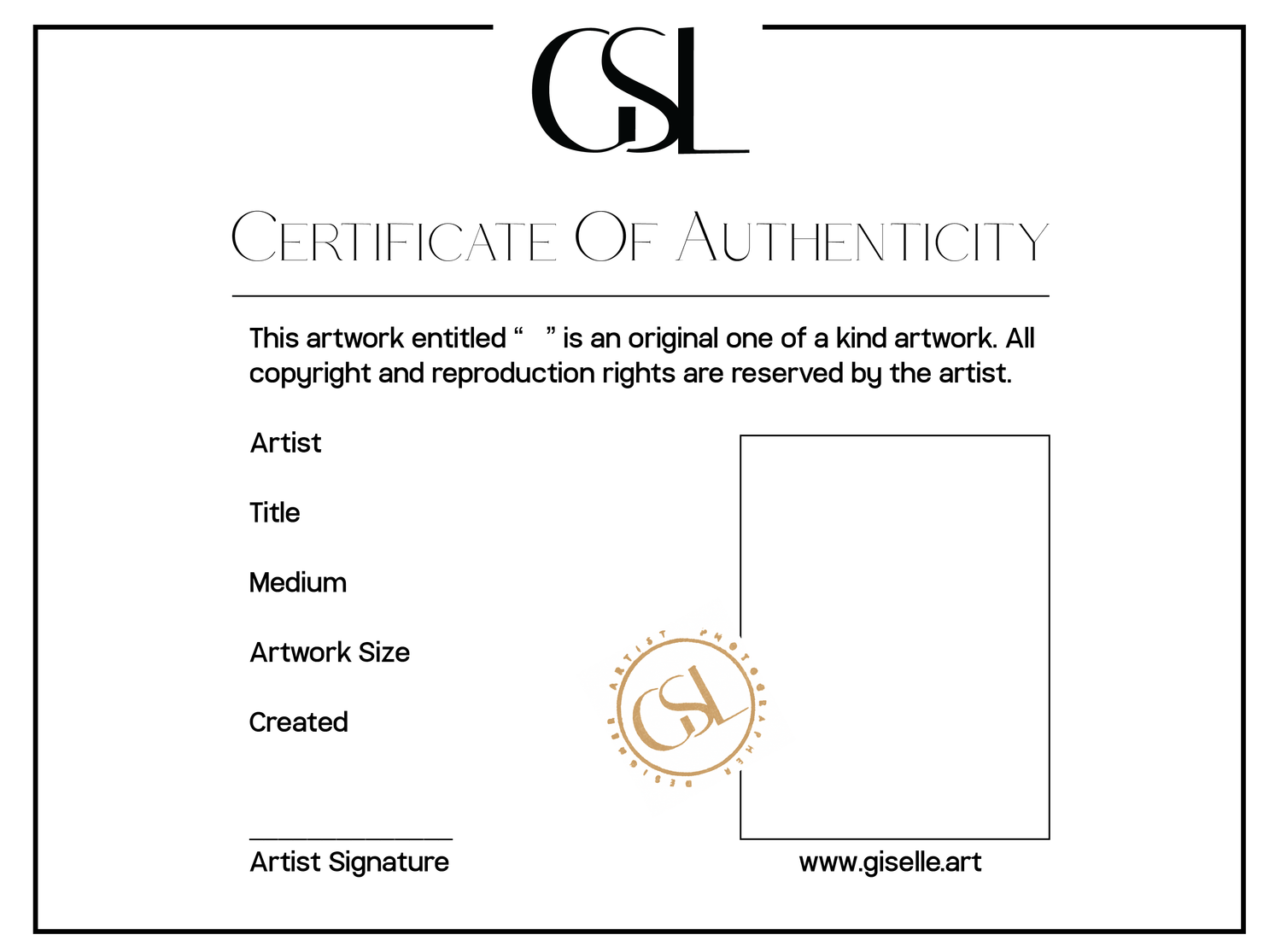 Signed by Giselle and includes an image of your purchased artwork. Originals will be noted as 1/1 with year. Buyers of printed images will receive a certificate indicating the print within the limited edition series.